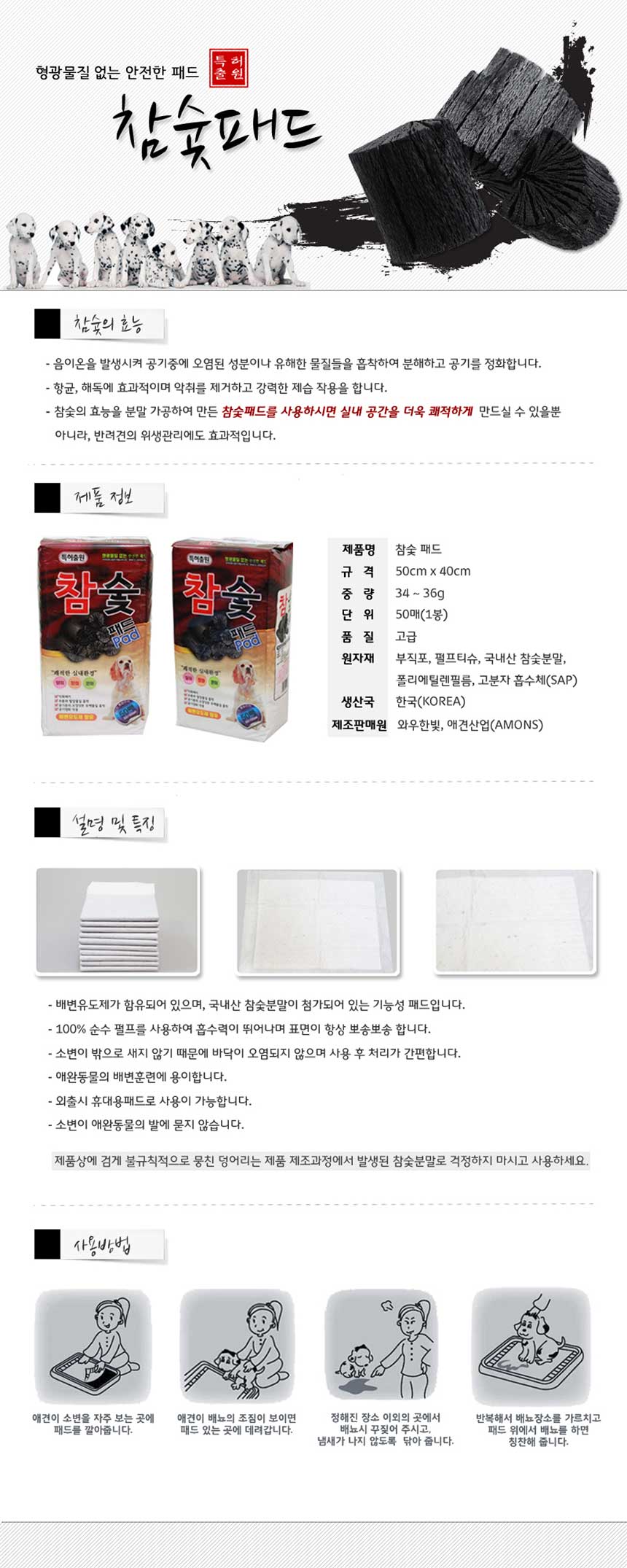home > 강아지 > 위생/배변용품 > 배변패드 > 와우한빛 참숯패드(참숯가루 함유) 일반형 1Bag(50매 x 6개)