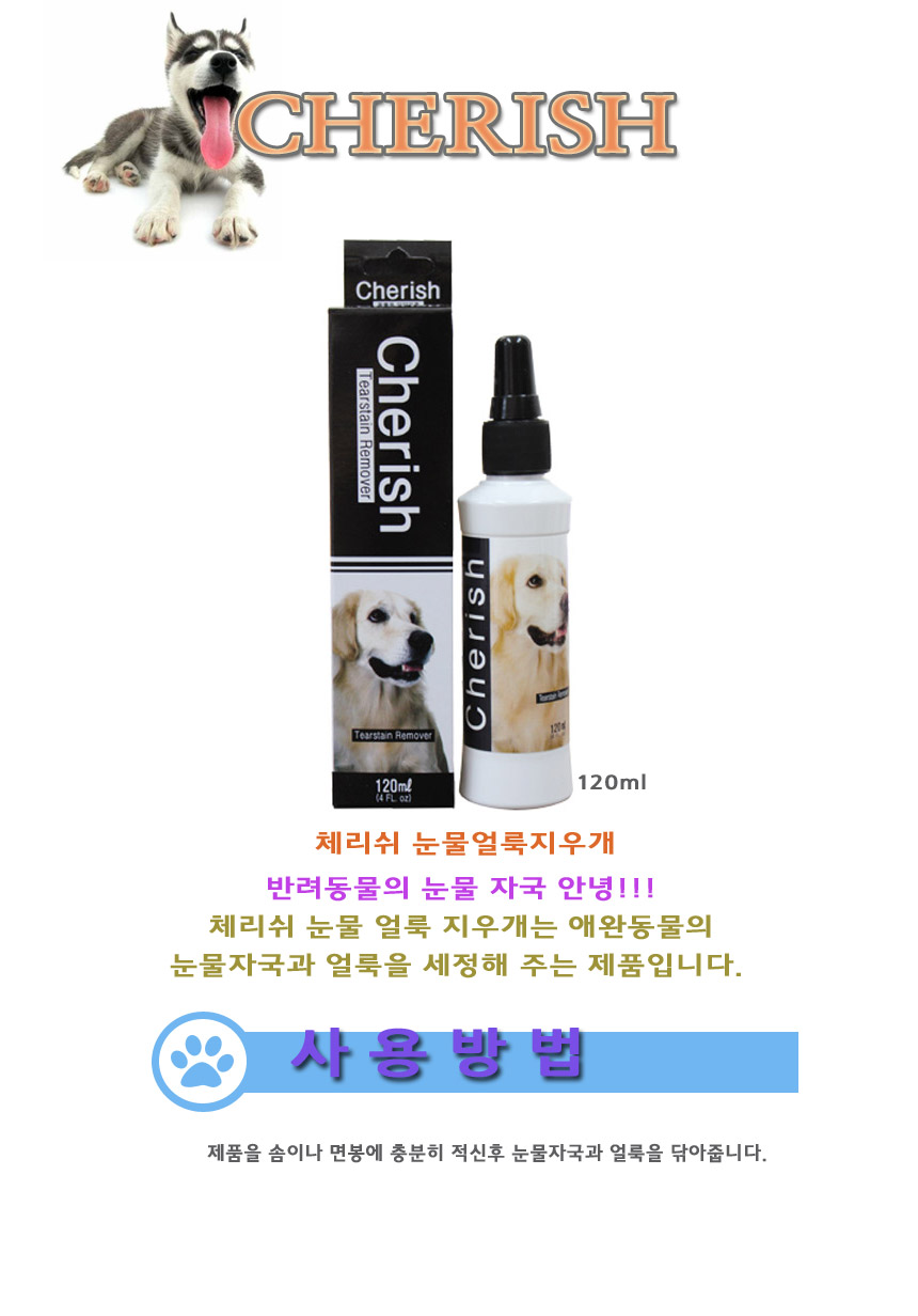 home > 강아지 > 목욕용품 > 눈/귀 관련 > Cherish 체리쉬 세정제 눈물얼룩 지우개 120ml
