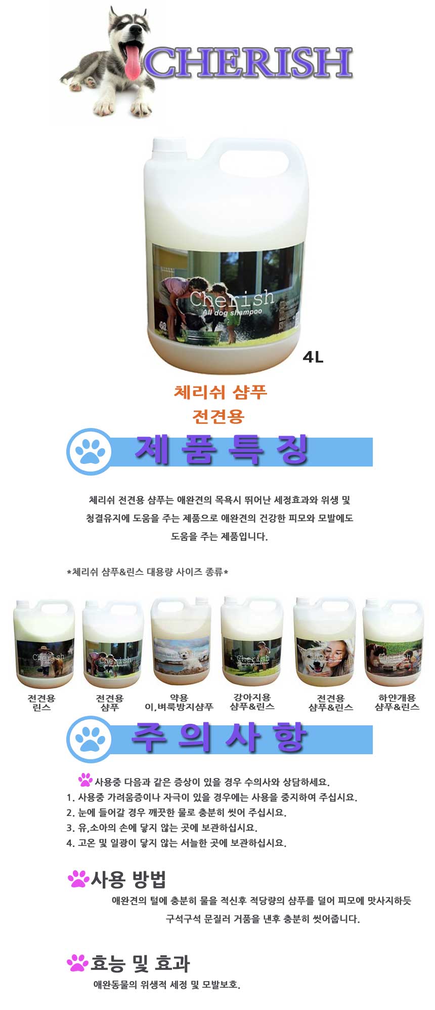 home > 강아지 > 목욕용품 > 샴푸/린스(컨디셔너)/비누 > Cherish 체리쉬 All Dog 샴푸 4L