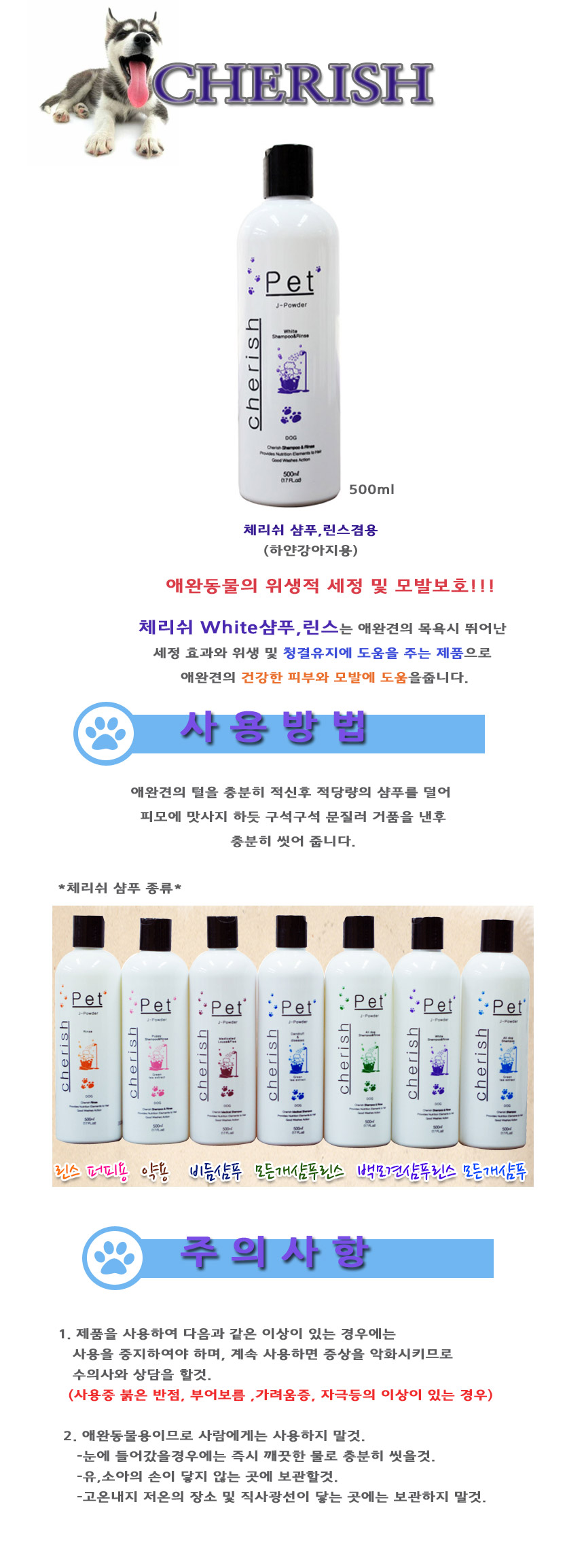 home > 강아지 > 목욕용품 > 샴푸/린스(컨디셔너)/비누 > Cherish 체리쉬 화이트 샴푸/린스(흰개용) 500ml